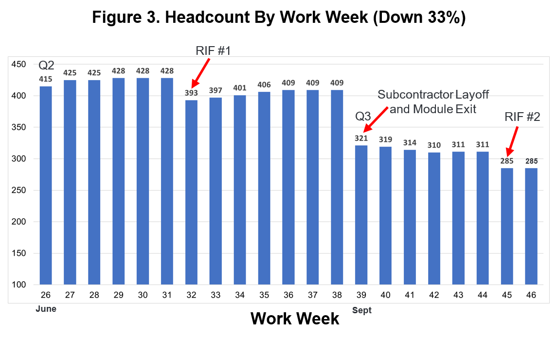 As shown in the headcount graph below, by the end of the second quarter (WW26), our headcount had been reduced to 415. In Q3 (WW39), two more RIFs reduced our headcount further to 321 in Q3, saving an incremental $10.6 million annually. Today (WW46), our headcount is down 33% to 285 and will be lower yet by the end of the quarter. And – as is typical – when the lean method is used, our performance has actually improved with fewer people.
