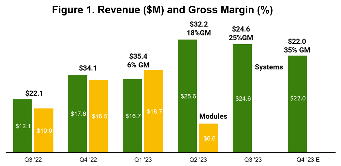 We now have a growing company with $88 million in annualized revenue that comes solely from the high-margin systems business. Our plan is to make that $88 million in revenue profitable as soon as possible by leaning out the organization further and increasing its efficiency using classic quality control methods. Paradoxically, our increase in orders into the line in Q3 slowed the fab down and thus again impeded revenue growth. Our plan after the five-week shutdown is to limit fab starts this quarter to produce $22 million in revenue in Q4 – and focus our engineering and operations efforts on making that $22 million more profitably, and with better quality. While it does not yet show up on the bottom line, we did make significant progress in the third quarter on our “North Star” plan to achieve profitability and cash flow independence in 2024.