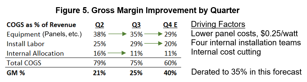 We improved gross margin from 18% in Q2 to 25% in Q3. The primary contributors to the improvement in Q3 were reductions in the cost of solar modules and other equipment and reduced headcount. These gains were partially offset by an increase in installation labor, especially in the Northeastern US. We invested in four internal installation teams which will provide lower Q4 installation costs. Our “GM47” project, which I personally run, is targeted to add ten percentage points to our Q3 GM of 25% this quarter, as quantified below: