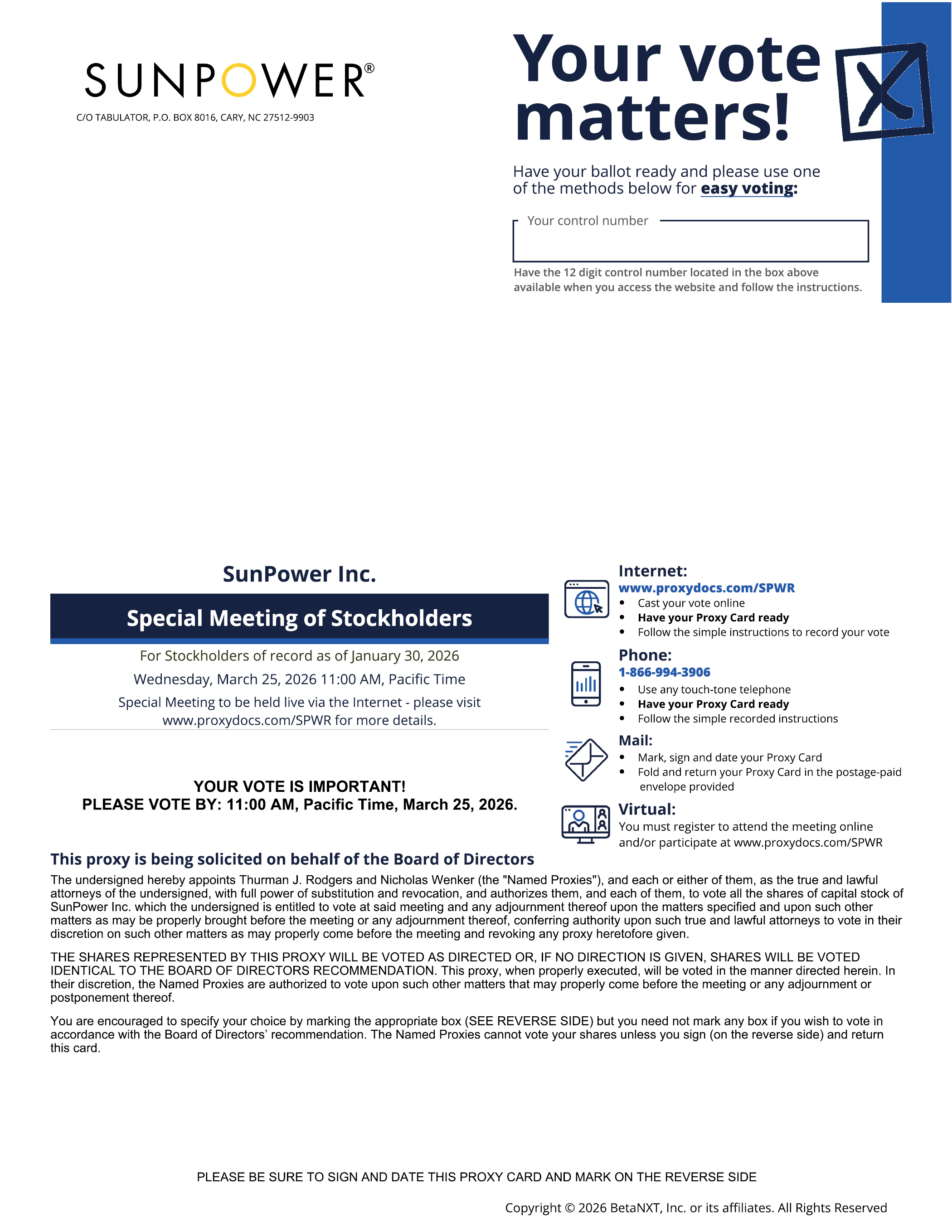 C/O TABULATOR, P.O. BOX 8016, CARY, NC 27512-9903 Have your ballot ready and please use one of the methods below for easy voting: Your vote matters! Your control number Have the 12 digit control number located in the box above available when you access the website and follow the instructions. SunPower Inc. Special Meeting of Stockholders For Stockholders of record as of January 30, 2026 Wednesday, March 25, 2026 11:00 AM, Pacific Time Special Meeting to be held live via the Internet - please visit www.proxydocs.com/SPWR for more details. C/O TABULATOR, P.O. BOX 8016, CARY, NC 27512-9903 Internet: www.proxydocs.com/SPWR • Cast your vote online • Have your Proxy Card ready • Follow the simple instructions to record your vote Phone: 1-866-994-3906 • Use any touch-tone telephone • Have your Proxy Card ready • Follow the simple recorded instructions Mail: • Mark, sign and date your Proxy Card • Fold and return your Proxy Card in the postage-paid envelope provided Virtual: You must register to attend the meeting online and/or participate at www.proxydocs.com/SPWR YOUR VOTE IS IMPORTANT! PLEASE VOTE BY: 11:00 AM, Pacific Time, March 25, 2026 This proxy is being solicited on behalf of the Board of Directors The undersigned hereby appoints Thurman J. Rodgers and Nicholas Wenker (the “Named Proxies”), and each or either of them, as the true and lawful attorneys of the undersigned, with full power of substitution and revocation, and authorizes them, and each of them, to vote all the shares of capital stock of SunPower Inc. which the undersigned is entitled to vote at said meeting and any adjournment thereof upon the matters specified and upon such other matters as may be properly brought before the meeting or any adjournment thereof, conferring authority upon such true and lawful attorneys to vote in their discretion on such other matters as may properly come before the meeting and revoking any proxy heretofore given. THE SHARES REPRESENTED BY THIS PROXY WILL BE VOTED AS DIRECTED OR, IF NO DIRECTION IS GIVEN, SHARES WILL BE VOTED IDENTICAL TO THE BOARD OF DIRECTORS RECOMMENDATION. This proxy, when properly executed, will be voted in the manner directed herein. In their discretion, the Named Proxies are authorized to vote upon such other matters that may properly come before the meeting or any adjournment or postponement thereof. You are encouraged to specify your choice by marking the appropriate box (SEE REVERSE SIDE) but you need not mark any box if you wish to vote in accordance with the Board of Directors’ recommendation. The Named Proxies cannot vote your shares unless you sign (on the reverse side) and return this card. PLEASE BE SURE TO SIGN AND DATE THIS PROXY CARD AND MARK ON THE REVERSE SIDE Copyright © 2026 BetaNXT, Inc. or its affiliates. All Rights Reserved