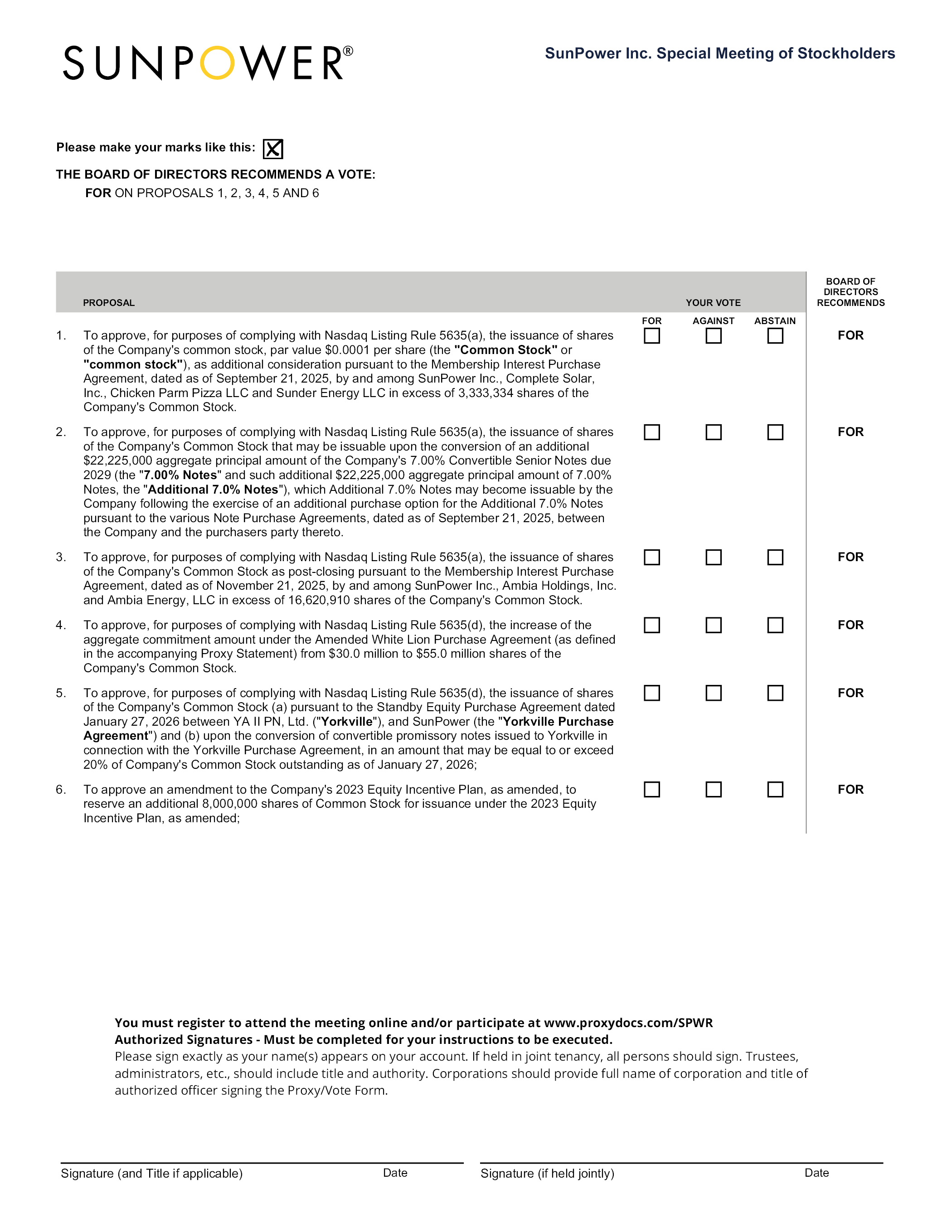 SunPower Inc. Special Meeting of Stockholders Please make your marks like this: THE BOARD OF DIRECTORS RECOMMENDS A VOTE: FOR ON PROPOSALS 1, 2, 3, 4, 5 AND 6 PROPOSAL YOUR VOTE BOARD OF DIRECTORS RECOMMENDS FOR AGAINST ABSTAIN 1. To approve, for purposes of complying with Nasdaq Listing Rule 5635(a), the issuance of shares of the Company’s common stock, par value $0.0001 per share (the “Common Stock” or “common stock”), as additional consideration pursuant to the Membership Interest Purchase Agreement, dated as of September 21, 2025, by and among SunPower Inc., Complete Solar, Inc., Chicken Parm Pizza LLC and Sunder Energy LLC in excess of 3,333,334 shares of the Company’s Common Stock. #P1# #P1# #P1# FOR 2. To approve, for purposes of complying with Nasdaq Listing Rule 5635(a), the issuance of shares of the Company’s Common Stock that may be issuable upon the conversion of an additional $22,225,000 aggregate principal amount of the Company’s 7.00% Convertible Senior Notes due 2029 (the “7.00% Notes” and such additional $22,225,000 aggregate principal amount of 7.00% Notes, the “Additional 7.0% Notes”), which Additional 7.0% Notes may become issuable by the Company following the exercise of an additional purchase option for the Additional 7.0% Notes pursuant to the various Note Purchase Agreements, dated as of September 21, 2025, between the Company and the purchasers party thereto. #P2# #P2# #P2# FOR 3. To approve, for purposes of complying with Nasdaq Listing Rule 5635(a), the issuance of shares of the Company’s Common Stock as post-closing pursuant to the Membership Interest Purchase Agreement, dated as of November 21, 2025, by and among SunPower Inc., Ambia Holdings, Inc. and Ambia Energy, LLC in excess of 16,620,910 shares of the Company’s Common Stock. #P3# #P3# #P3# FOR 4. To approve, for purposes of complying with Nasdaq Listing Rule 5635(d), the increase of the aggregate commitment amount under the Amended White Lion Purchase Agreement (as defined in the accompanying Proxy Statement) from $30.0 million to $55.0 million shares of the Company’s Common Stock. #P4# #P4# #P4# FOR 5. To approve, for purposes of complying with Nasdaq Listing Rule 5635(d), the issuance of shares of the Company’s Common Stock (a) pursuant to the Standby Equity Purchase Agreement dated January 27, 2026 between YA II PN, Ltd. (“Yorkville”), and SunPower (the “Yorkville Purchase Agreement”) and (b) upon the conversion of convertible promissory notes issued to Yorkville in connection with the Yorkville Purchase Agreement, in an amount that may be equal to or exceed 20% of Company’s Common Stock outstanding as of January 27, 2026; #P5# #P5# #P5# FOR 6. To approve an amendment to the Company’s 2023 Equity Incentive Plan, as amended, to reserve an additional 8,000,000 shares of Common Stock for issuance under the 2023 Equity Incentive Plan, as amended; #P6# #P6# #P6# FOR Proposal_Page - VIFL You must register to attend the meeting online and/or participate at www.proxydocs.com/SPWR Authorized Signatures - Must be completed for your instructions to be executed. Please sign exactly as your name(s) appears on your account. If held in joint tenancy, all persons should sign. Trustees, administrators, etc., should include title and authority. Corporations should provide full name of corporation and title of authorized officer signing the Proxy/Vote Form. Signature (and Title if applicable) Date Signature (if held jointly) Date