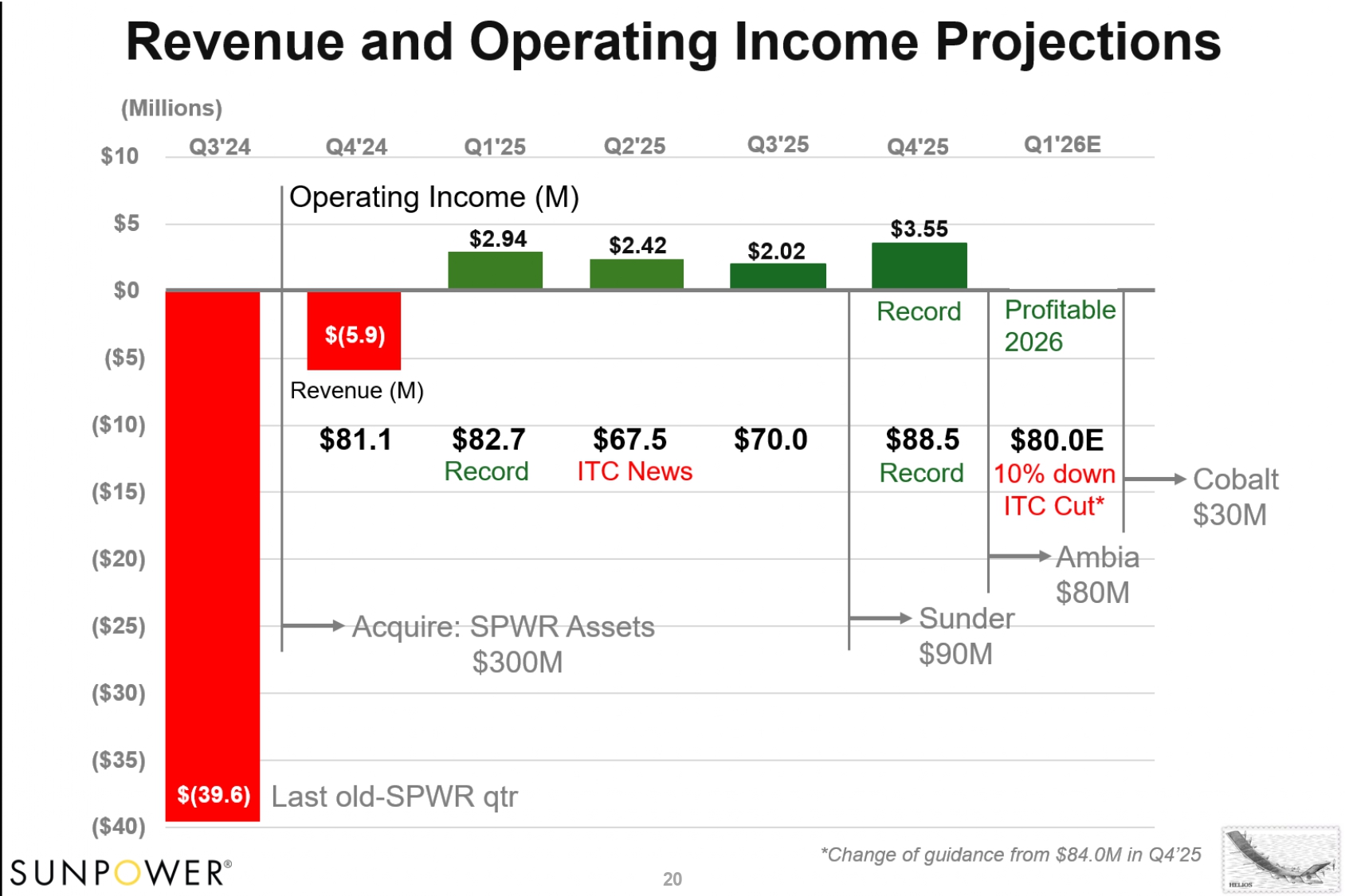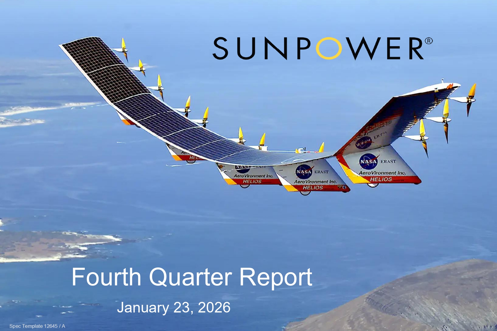 2 Forward Looking Statements This presentation contains forward - looking statements within the meaning of Section 27 A of the Securities Act of 1933 , as amended, and Section 21 E of the Securities Exchange Act of 1934 , as amended, about us and our industry that involve substantial risks and uncertainties . Forward - looking statements generally relate to future events or our future financial or operating performance . In some cases, you can identify forward - looking statements because they contain words such as “preliminary,” “will,” “goal,” “prioritize,” “plan,” “target,” “expect,” “in the process,” “focus,” “forecast,” “look forward,” “opportunity,” “believe,” “estimate,” “continue,” “anticipate,” and “pursue” or the negative of these terms or similar expressions . Forward - looking statements in this presentation include, without limitation, our Q 4 ’ 25 , 2025 and 2026 revenue and operating profit projections, our expectations regarding our Q 4 ’ 25 and fiscal 2025 and 2026 financial performance ; our forecasted revenue per employee ; the anticipated timing for the filing of the 2025 Form 10 - K ; expectations relating to the monolith panel and related JDA ; expectations related to our contemplated acquisition of Cobalt, including that we expect to enter into binding definitive agreements and our expectations regarding the benefits of such acquisition ; our expectations regarding the timing of and our ability to raise additional capital, including with respect to debt and equity deals currently in progress ; expectations relating to the integration of Sunder Energy and Ambia Solar, and anticipated benefits of these acquisitions, the anticipated benefits of the Purelight salesforce acquisition ; expectations and plans relating to further cost control efforts ; expectations relating to forecasted revenue - to - employee metrics ; our work to raise our P/S ratio ; expectations relating to our cash balances . Actual results could differ materially from these forward - looking statements as a result of certain risks and uncertainties, including, without limitation, our ability to implement further headcount reductions and cost controls, our ability to integrate and operate the combined business with Sunder and Ambia, our ability to achieve the anticipated benefits of acquisitions (including Sunder, Ambia and Cobalt), our ability to raise capital and maintain expected cash balances, global market conditions, any adjustments, changes or revisions to our financial results arising from our financial closing procedures, the completion of our financial statements for 2025 and the filing of the related Form 10 K, and other risks and uncertainties applicable to our business . For additional information on these risks and uncertainties and other potential factors that could affect our business and financial results or cause actual results to differ from the results predicted, readers should carefully consider the foregoing factors and the other risks and uncertainties described in the “Risk Factors” section of our annual report on Form 10 - K filed with the SEC on April 30 , 2025 , our quarterly reports on Form 10 - Q filed with the SEC and other documents that we have filed with, or will file with, the SEC . Such filings identify and address other important risks and uncertainties that could cause actual events and results to differ materially from those contained in the forward - looking statements . Forward - looking statements in this presentation speak only as of the date they are made . Readers are cautioned not to put undue reliance on forward - looking statements, and SunPower assumes no obligation and does not intend to update or revise these forward - looking statements, whether as a result of new information, future events, or otherwise . Preliminary and Unaudited Financial Results The selected unaudited financial results for the Q 4 ’ 25 and fiscal 2025 are preliminary and subject to our quarter and year - end accounting procedures . As a result, the financial results presented in this presentation may change in connection with the finalization of our closing and reporting processes and financial statements for Q 4 ’ 25 and fiscal 2025 and may not represent the actual financial results for such period . In addition, the information in this presentation is not a comprehensive statement of our financial results for Q 4 ’ 25 and fiscal 2025 , should not be viewed as a substitute for financial statements prepared in accordance with generally accepted accounting principles, and are not necessarily indicative of our results for any future period . Non - GAAP Financial Measures In addition to providing financial measurements based on generally accepted accounting principles in the United States of America ("GAAP"), SunPower provides additional financial metrics in this presentation that are not prepared in accordance with GAAP ("non - GAAP") . Management believes the non - GAAP financial measures in this presentation, in addition to GAAP financial measures, are useful measures of operating performance because the non - GAAP financial measures do not include the impact of items that management does not consider indicative of SunPower’s operating performance, such as amortization of goodwill and expensing employee stock options in addition to accounting for their dilutive effect, which facilitates the analysis of SunPower’s core operating results across reporting periods . The non - GAAP financial measures do not replace the presentation of SunPower’s GAAP financial results and should only be used as a supplement to, not as a substitute for, SunPower’s financial results presented in accordance with GAAP . Descriptions of and reconciliations of the non - GAAP financial measures used in this presentation are included in the financial table above and related footnotes . We encourage investors to carefully