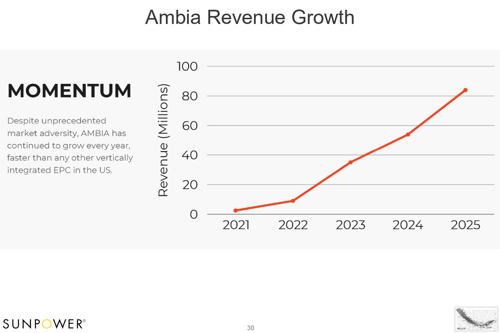 Ambia = $80M Revenue + World - Class EVPs Conner Ruggio, Co - Founder and CEO Former President of Sales of Aptive Environmental ($650M Exit) Athlete: Ironman & Ultra Marathon MBA (Univ. of Utah), BS Economics (BYU) SunPower: Co - EVP of Combined Sales Forces Spencer Jensen, COO Former COO of BlueRaven, Operations: McMaster - Carr BS Chemical Engineering (BYU), MBA (UNC Chapel Hill) SunPower: SVP SPWR Direct Operations 29